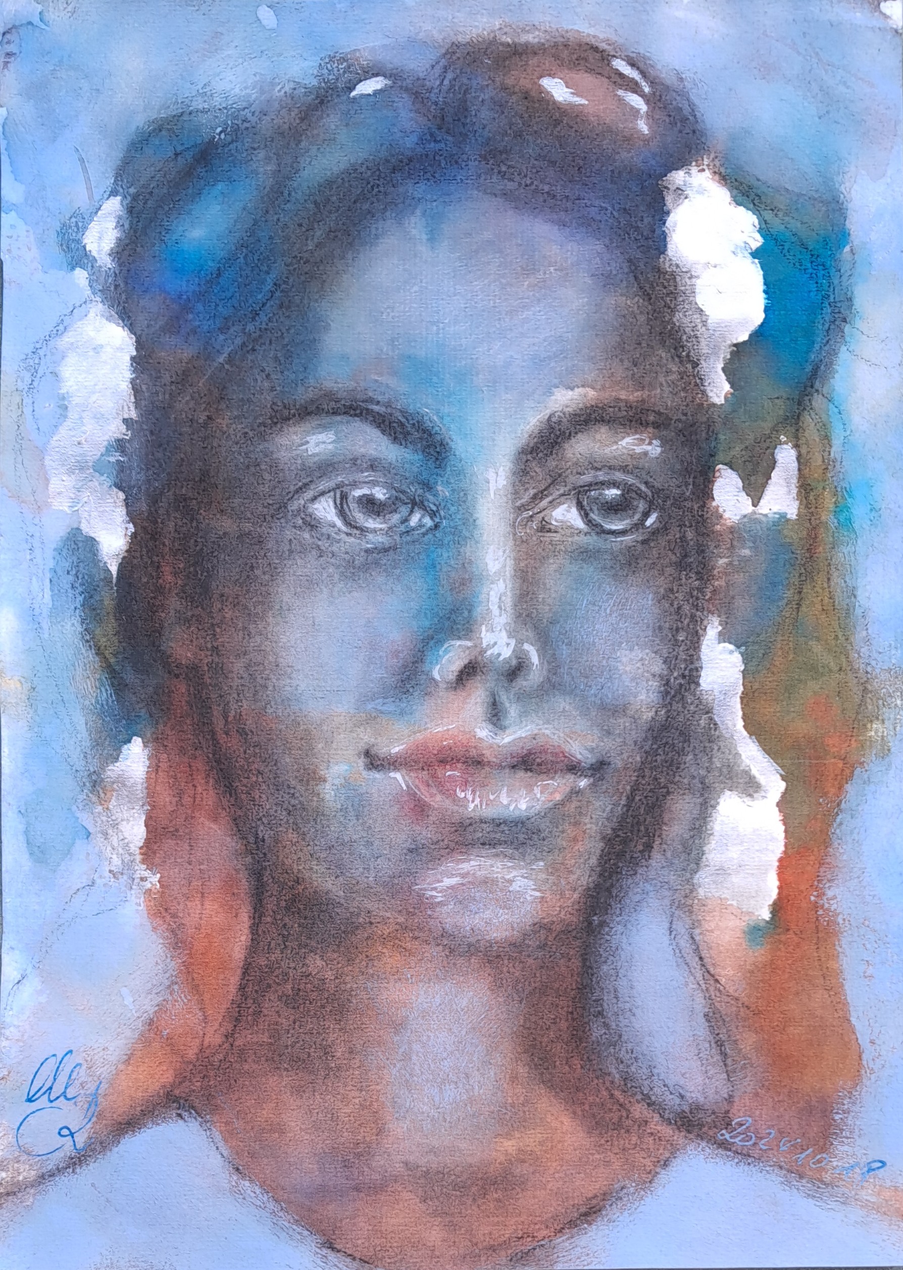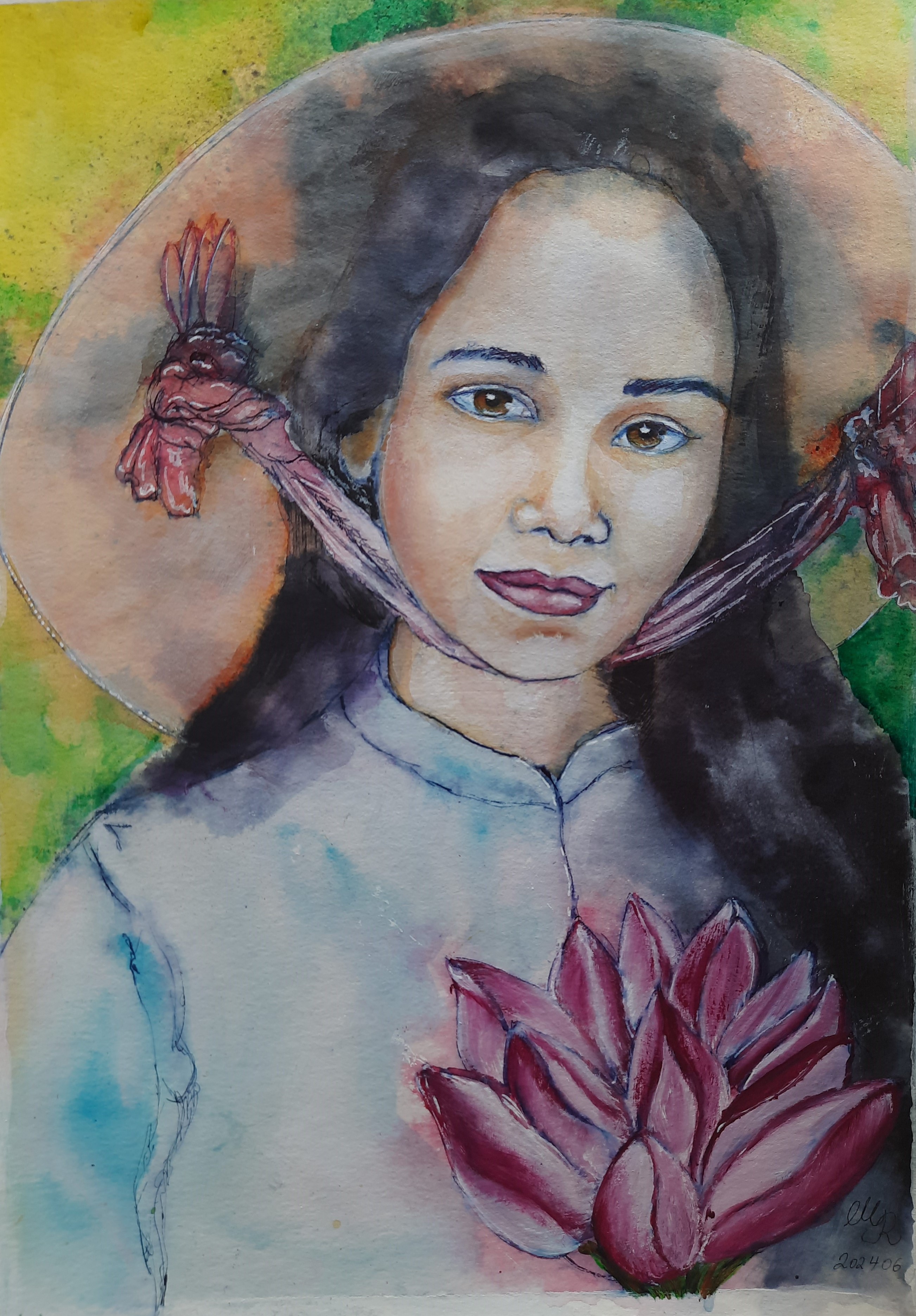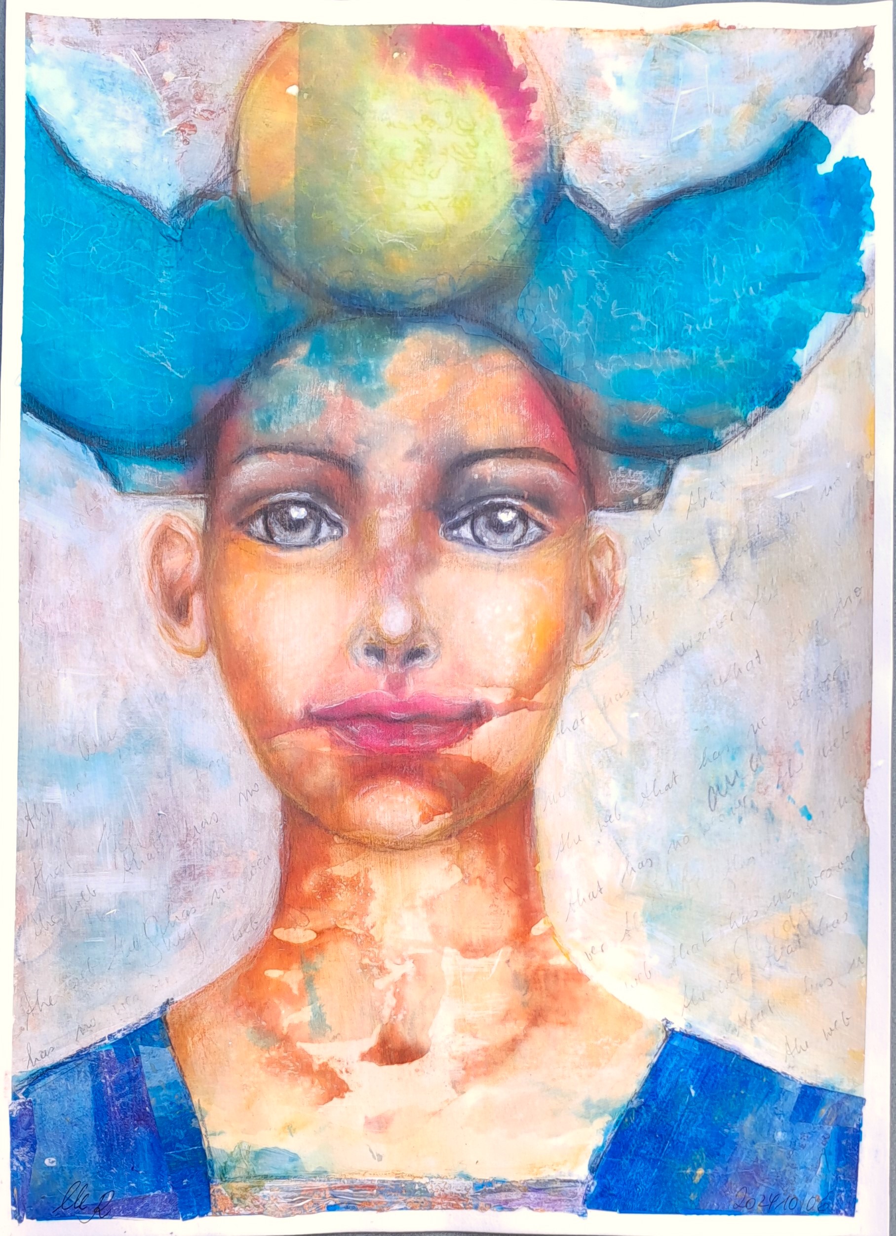 Dieses Bild entstand im Anschluss an eine Lektion aus Lets Face It 2024, Week 18, von Maria Pace-Wynters, weil mir die Technik mit Tinte so gut gefiel und sie dem intuitiv-spielerischen Malen und Fließenlassen so nahe kam. (Vorlage, Umsetzung und weitere Herangehensweise differieren allerdings). Nach dem ersten Schreck, wenn das Wasser die Tinte völlig auflöst und das "schöne Bild" zerstört, beginnt erst der eigentlche Kreativvorgang (siehe Kommentare ("the ugly phase"). Am beeindruckendsten an Maria's Herangehensweise sind die vielen Wiederholungen des selben Arbeitsvorgangs, der es erlaubt "vielschichtige" Ebenen zu bilden.