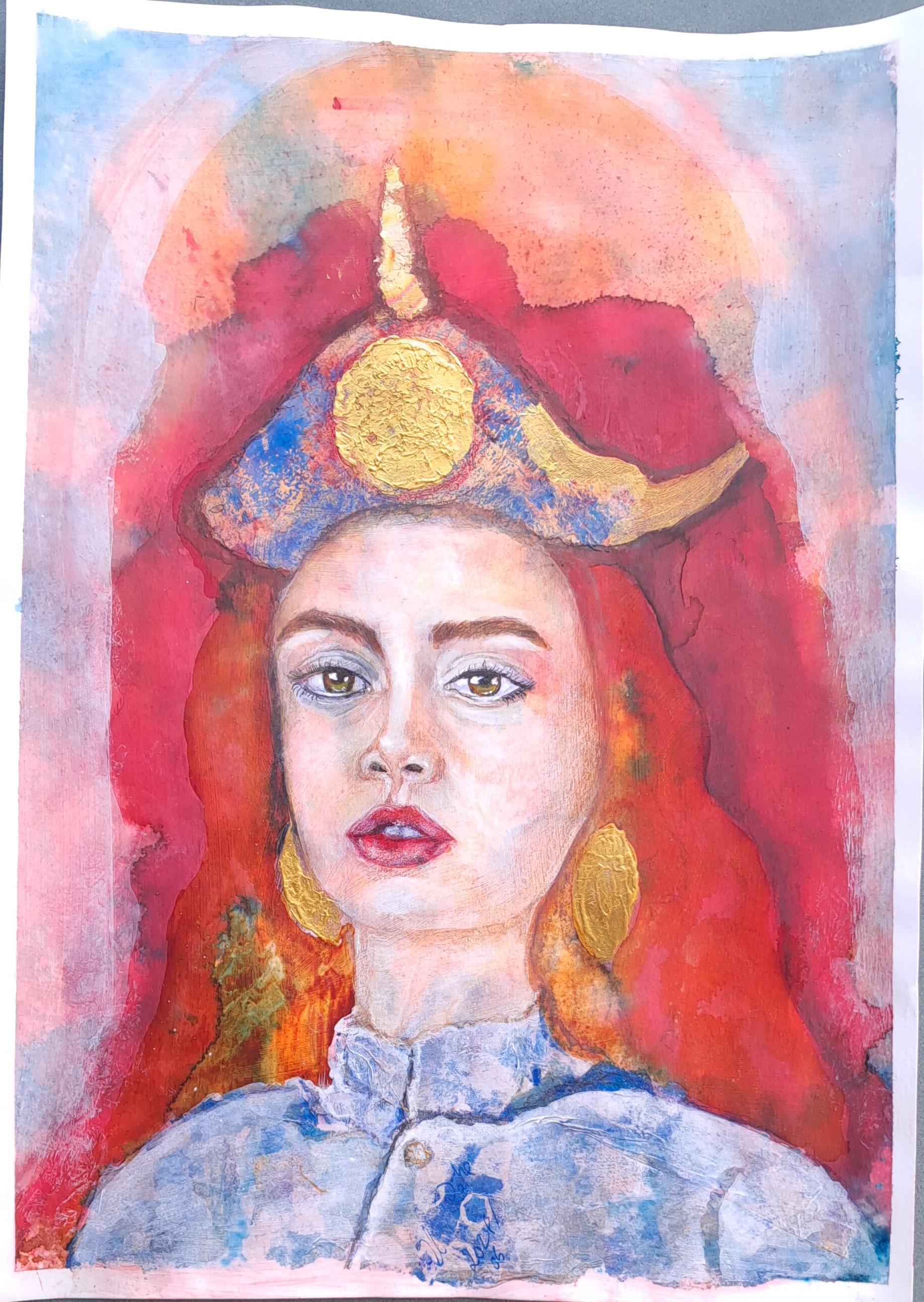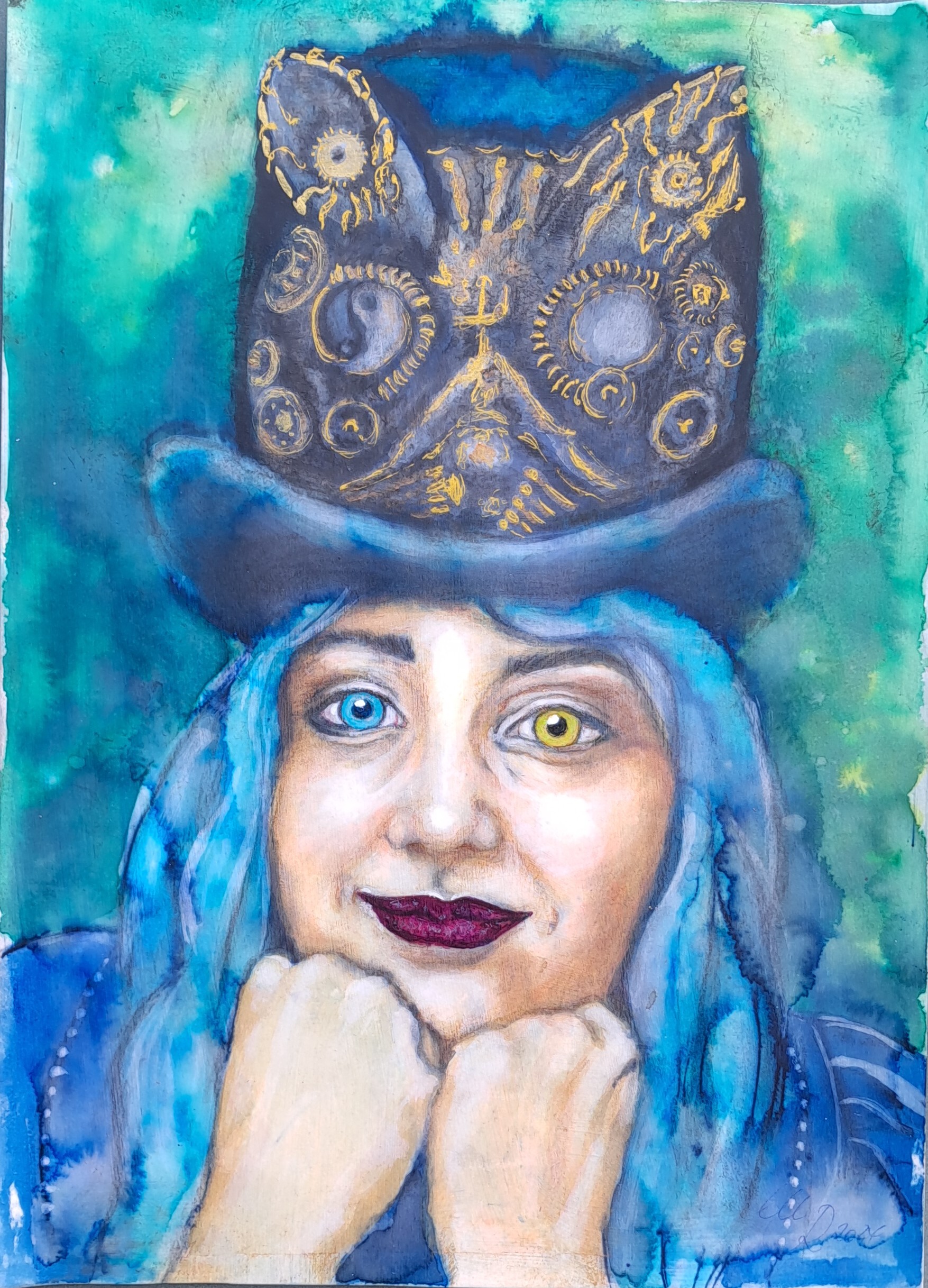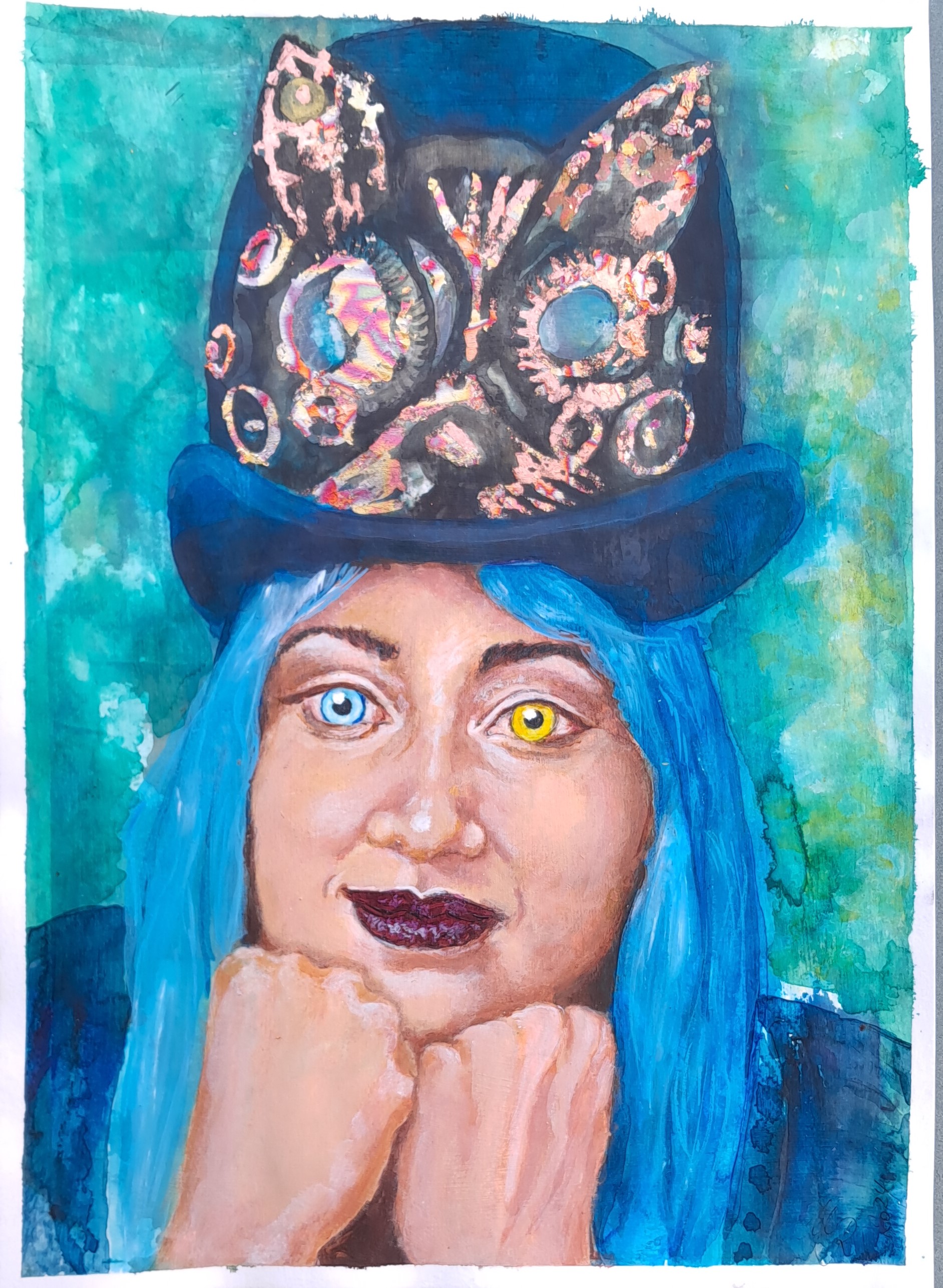 A3, (nur) Acryl Dasselbe Motiv noch einmal anders umgesetzt und mit Kupfer- und Goldblättern als Highlights im Hut versehen. Vorlage: Courtesy to Eduardo Gonzalez, Unsplash